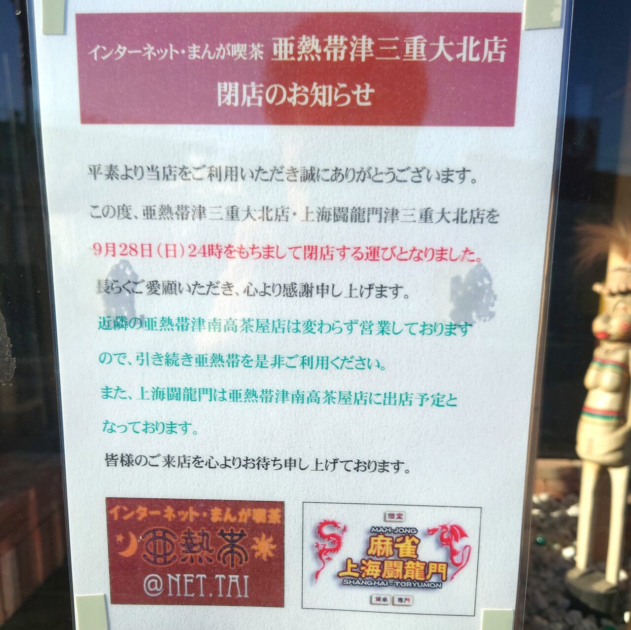 いただいた情報、および写真によると、閉店は2025年9月28日(日)。公式ホームページにはすでに店舗情報がなくなっています。併設されていた「麻雀上海闘龍門 津三重大北店」も同日に閉店となっていますが、こちらは「亜熱帯 津南高茶屋店」に出店予定との記載があります。↓