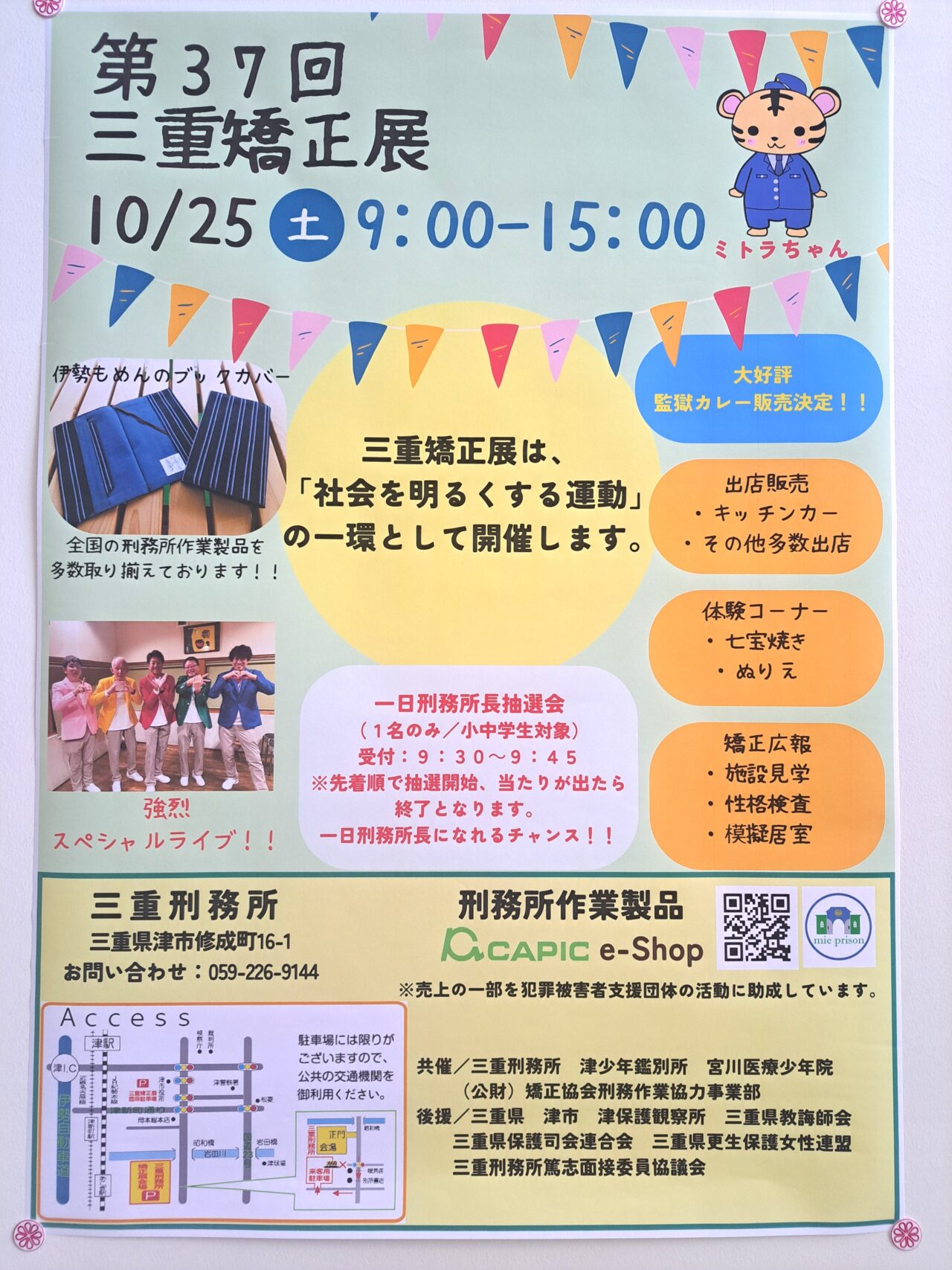 毎年開催されている「三重矯正展」が、2025年も開催される、との情報をいただきました。このイベントは、全国の刑務所作業製品の展示や即売、刑務作業体験(ぬりえ、七宝焼き)などが楽しめるイベントです。キッチンカーの出店や、刑務所で提供されているメニューである“監獄カレー”の販売も予定されているようです♪