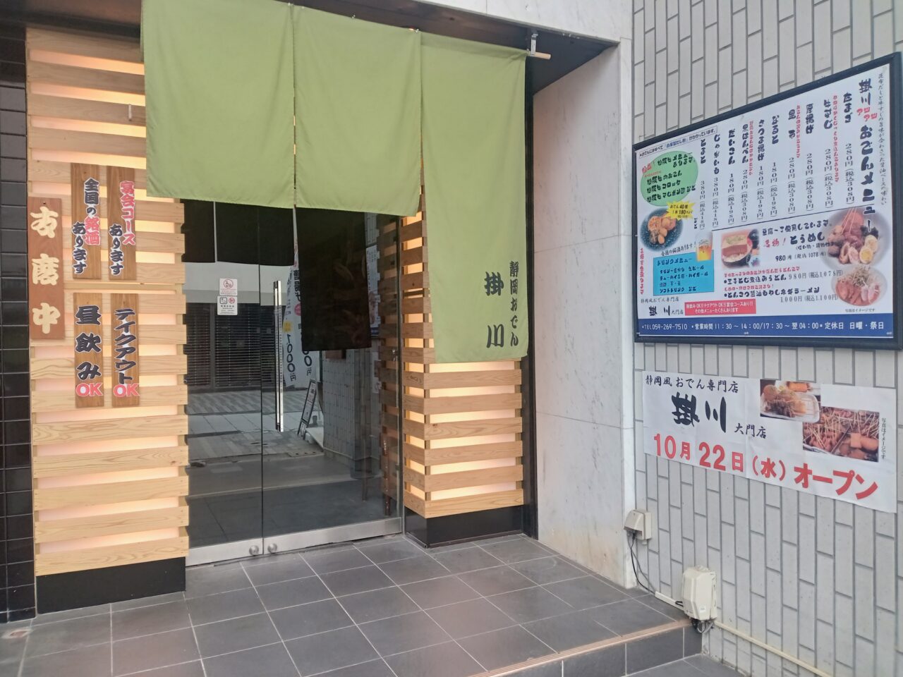 2025年10月22日(水)、津市大門に静岡おでん専門店「掛川 大門店」がオープンした、との情報をいただきました♪