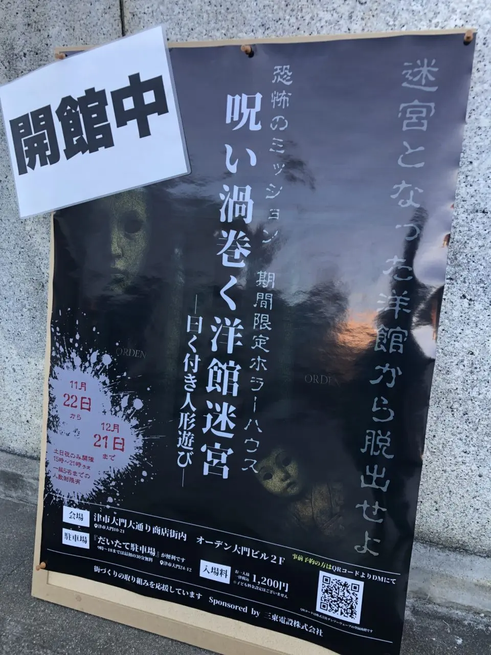 津市大門に期間限定のお化け屋敷が登場している、との情報をいただきました! 2025年11月22日(土)からホラーハウス「呪い渦巻く洋館迷宮」が、期間限定でオープンしているようですよ♪