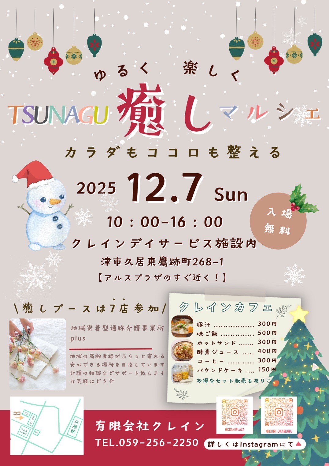 2025年12月7日(日)、津市久居にある有限会社クレインにて「TSUNAGU癒しマルシェ」が開催されるようです♪