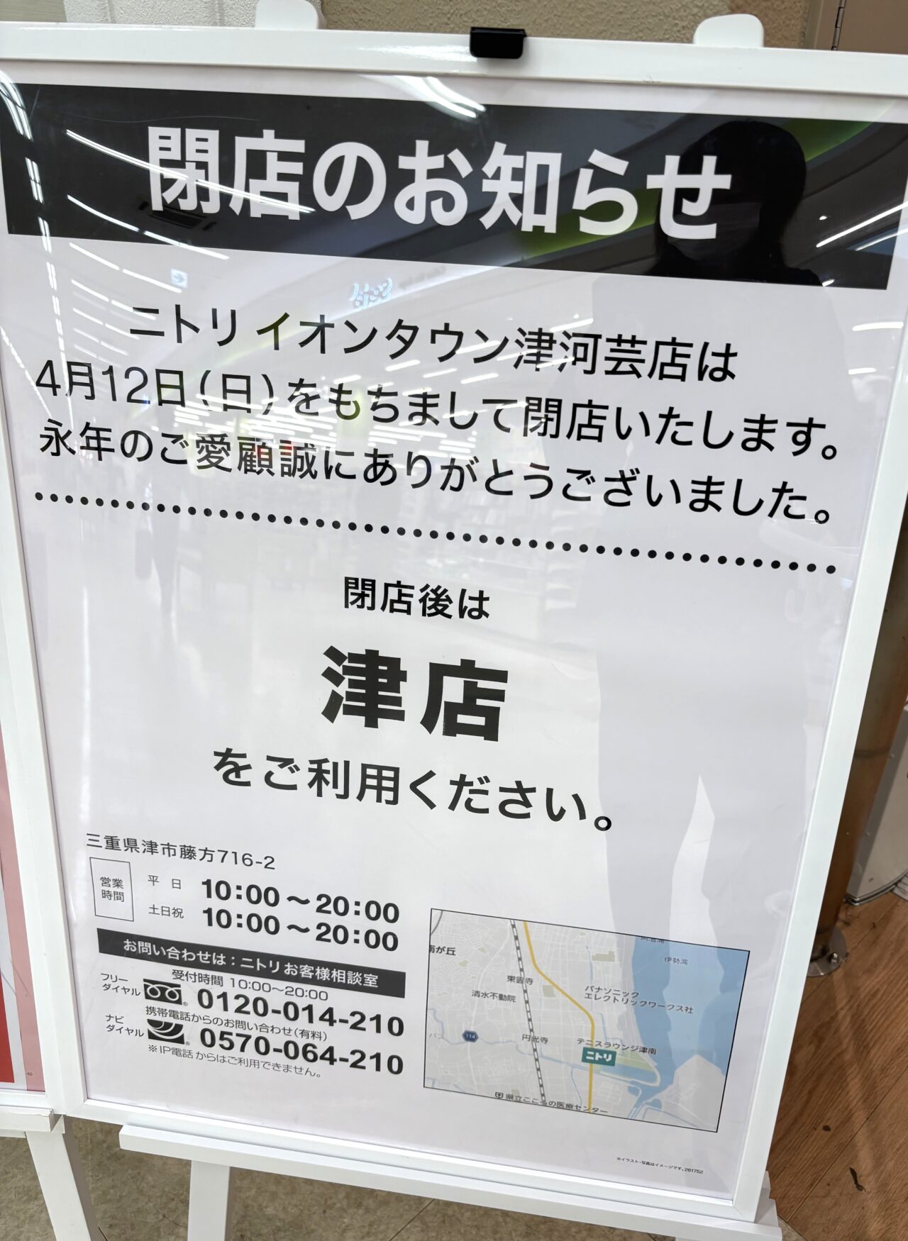 ニトリの公式サイトやイオンタウン津河芸の公式サイトなどには、閉店についての記載は今のところ見られませんが、現在店舗には下の写真の通り、閉店のお知らせが出ているようです。